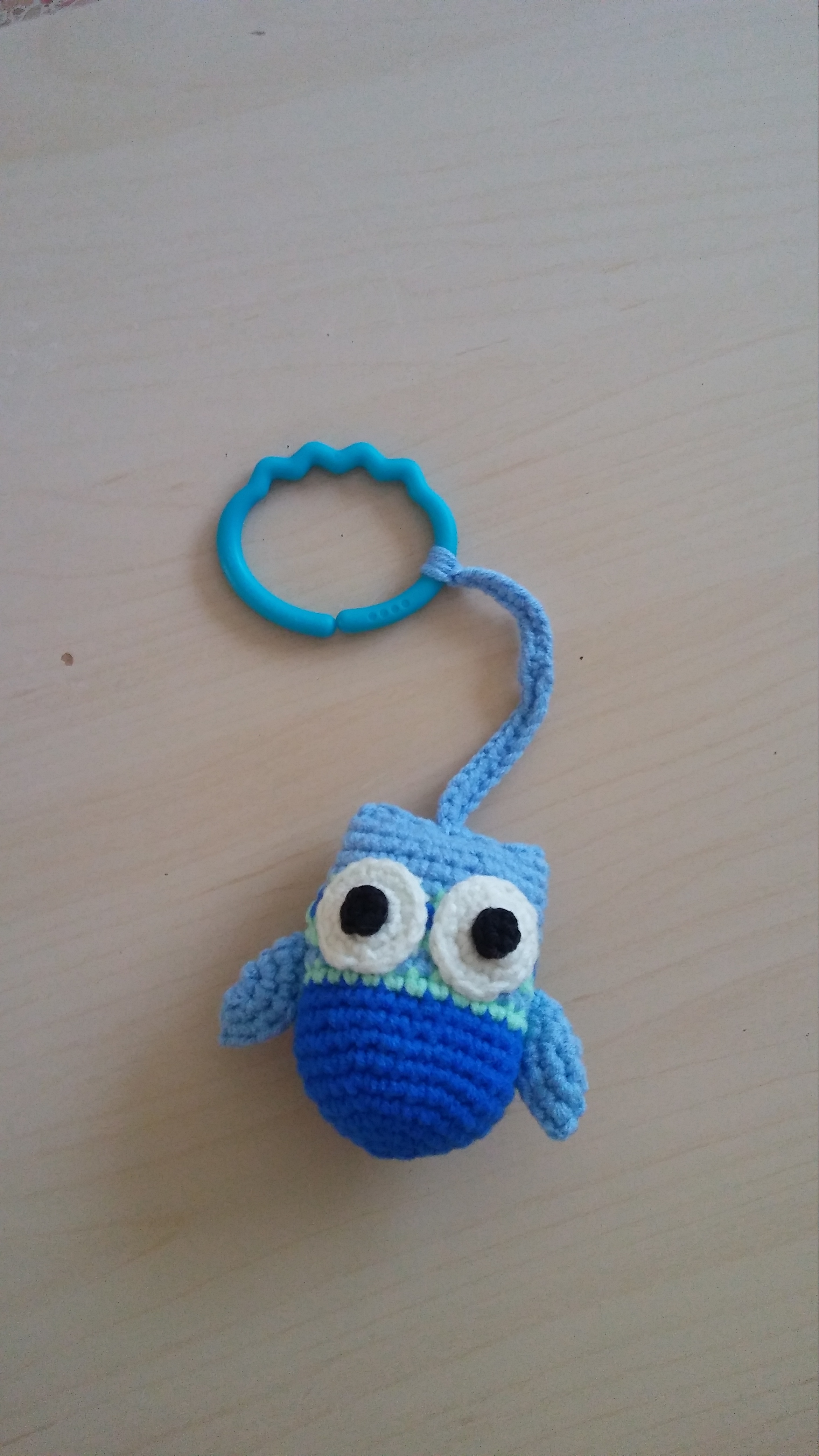 ינשוף סרוג בגוונים כחולים בעל מילוי רך סרוג בחוטי כותנה, מכיל צפצפה וניתן לתלייה נוחה על מיטת התינוק או העגלה.