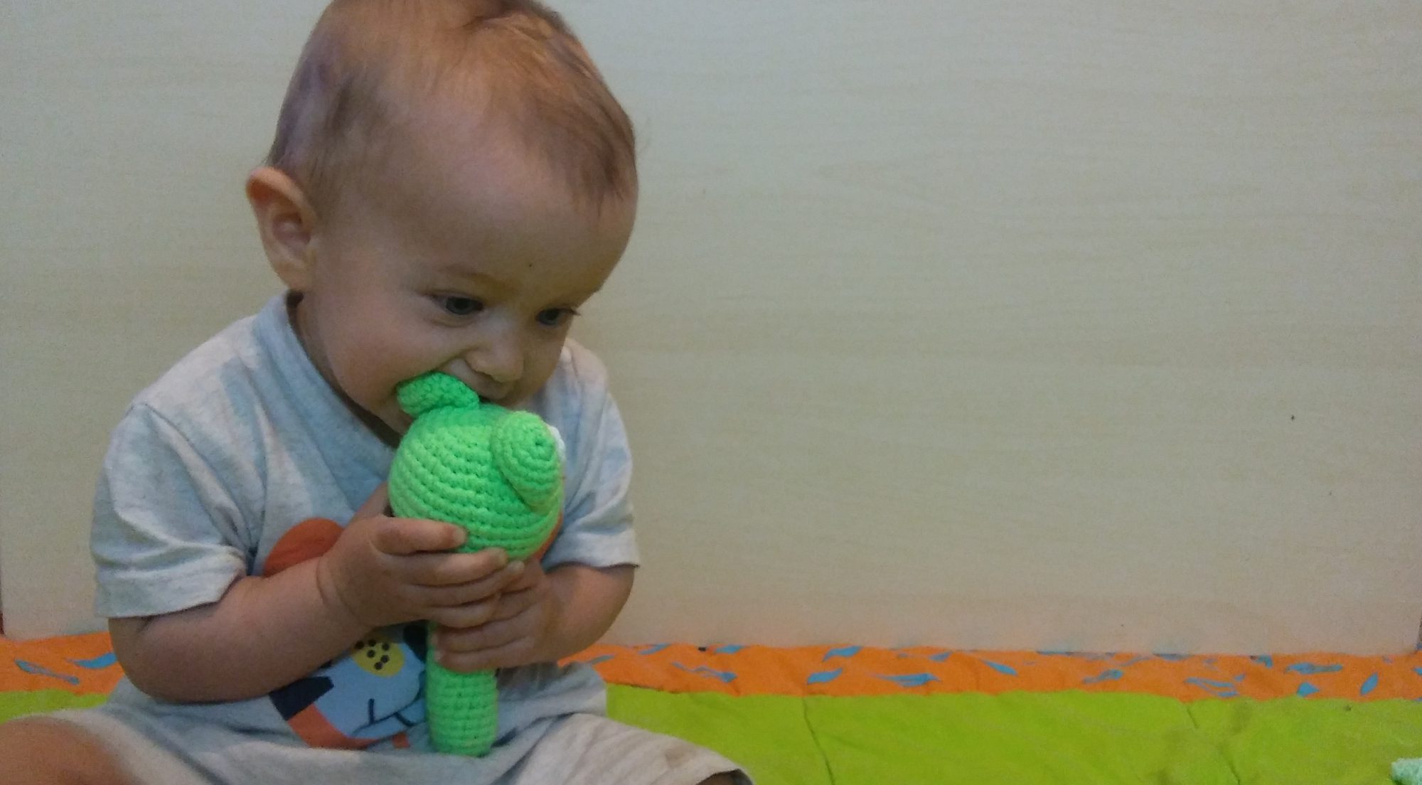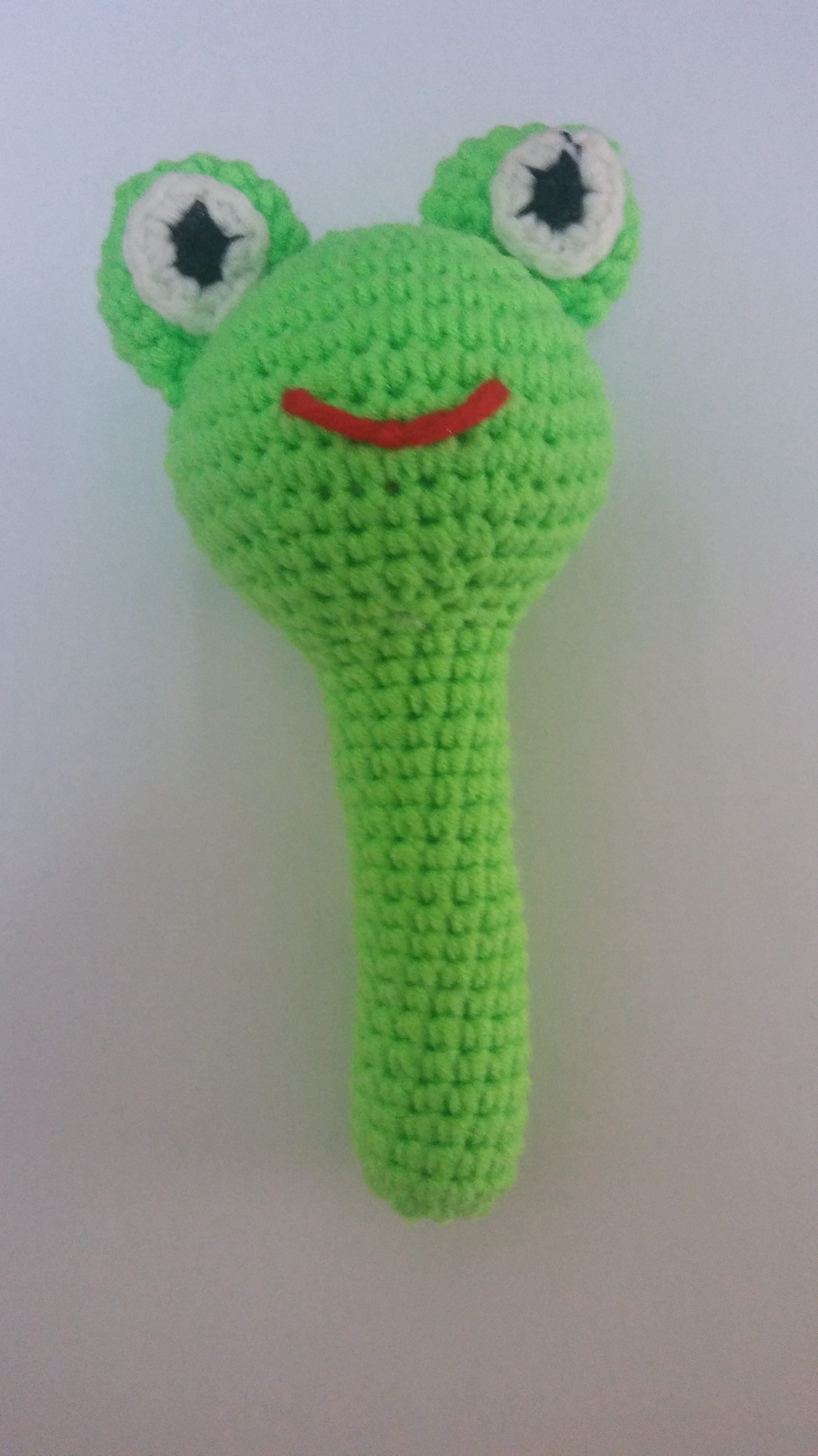 רעשן בצורת צפרדע סרוג מחוטי כותנה, במילוי רך בעל ידית אחיזה המתאימה לכף ידו של התינוק, מכיל פעמון