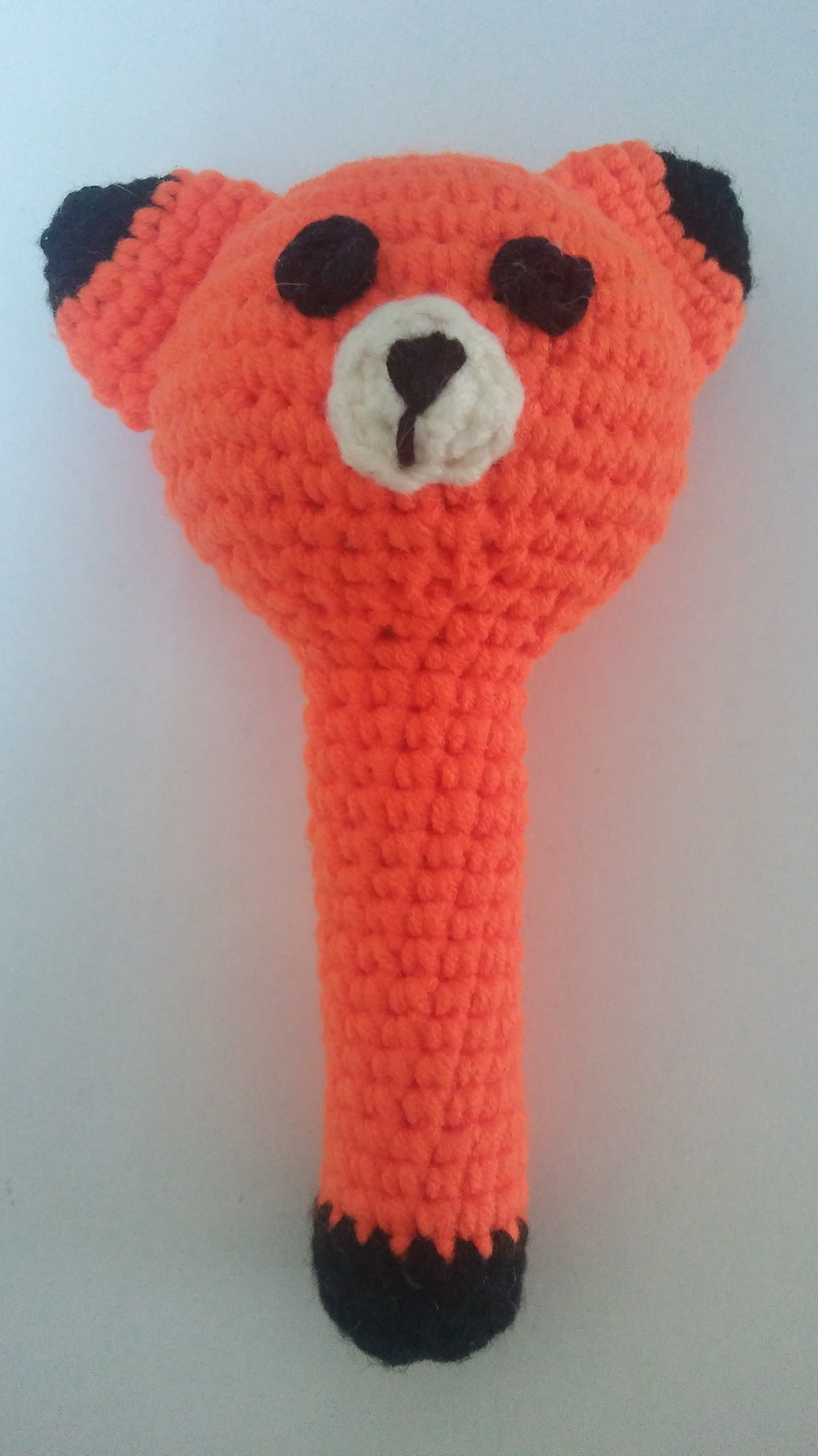 רעשן בצורת שועל, סרוג מחוטי כותנה, במילוי רך ובעל ידית אחיזה המתאימה לכף ידו של התינוק, מכיל פעמון.
